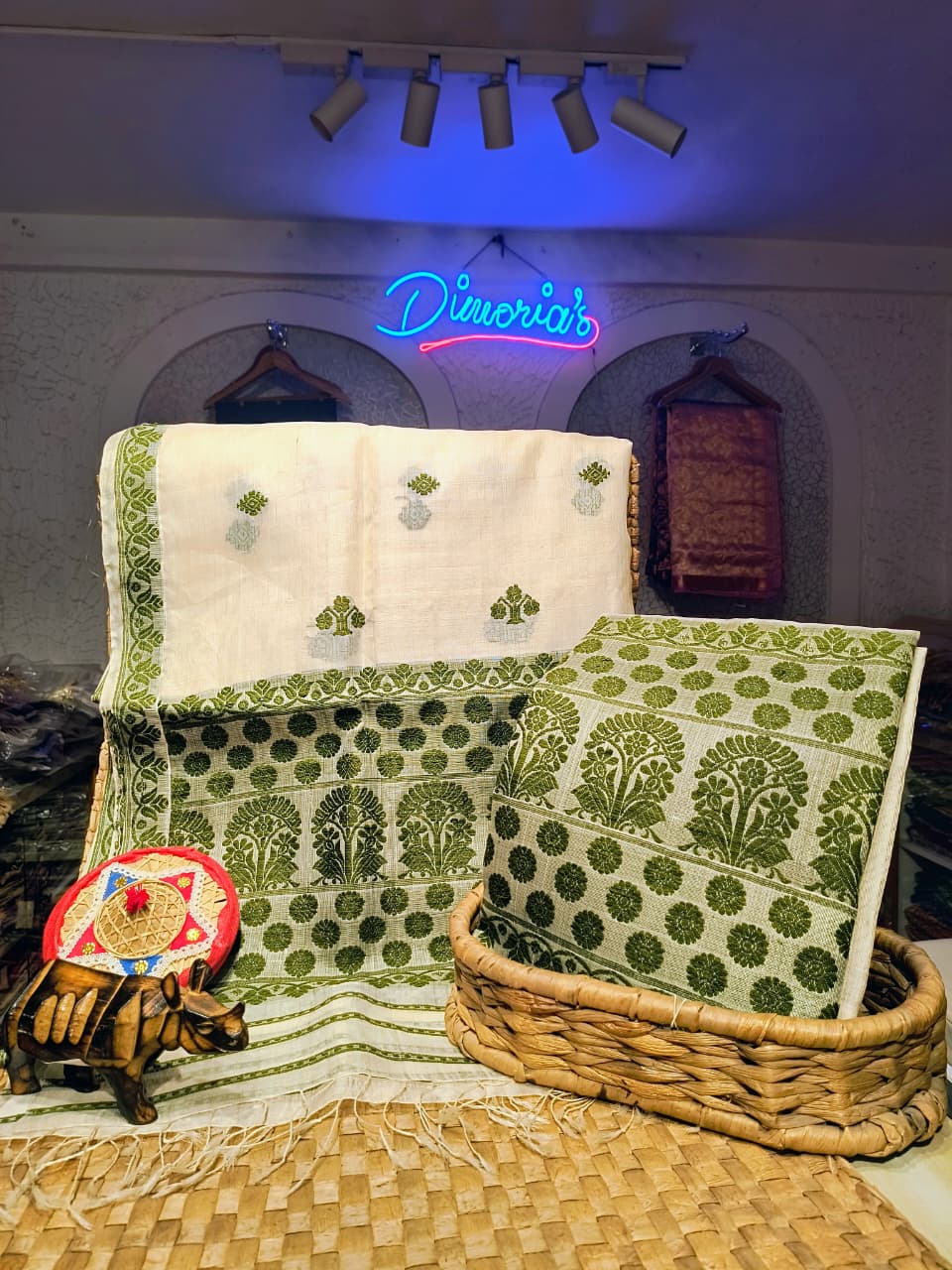 Material: Nuni silk/Nuni silk Motif: Assamese traditional design Gosbuta Colour: Off white & green Size: Sador: 3.00m×0.97m Mekhela : 2.56m×0.97m Net Weight: 480 grams GSM: 90 g/m² One Un-stitched blouse piece